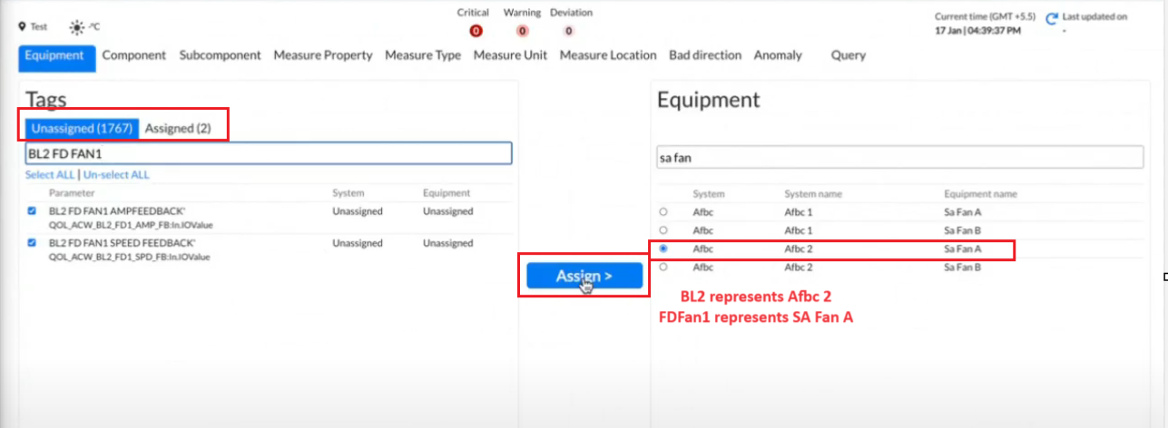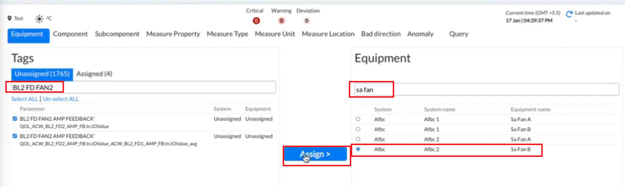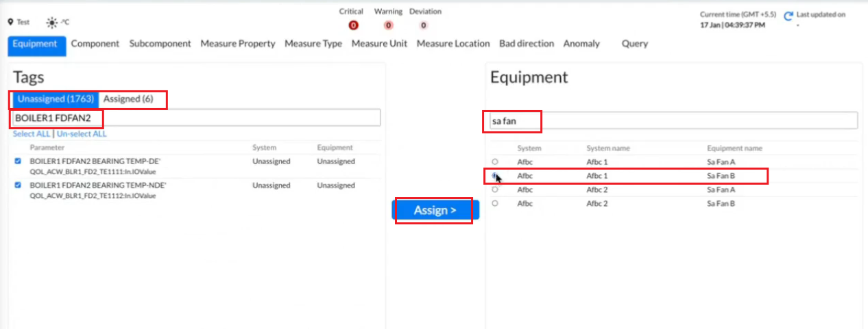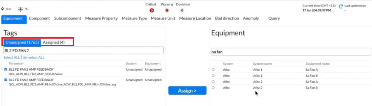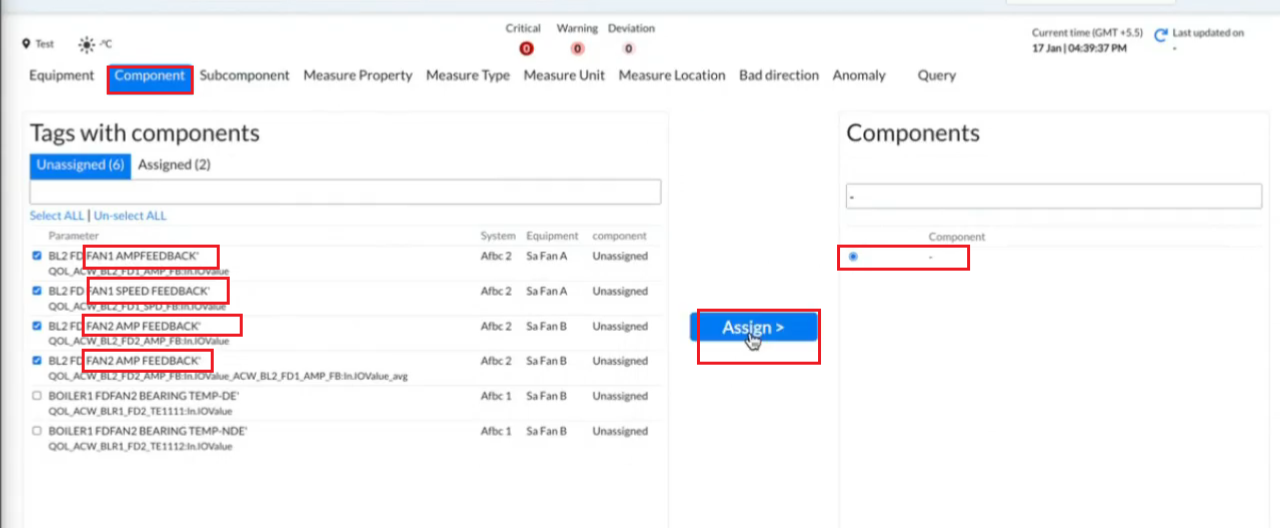 For the bearing Fan, we assign “motor” as the motor is related to the bearing fan. So select motor on the right side and bearing fan temp on the left side for all those tags you want to assign “motor” as “component”. Click on “Assign”.