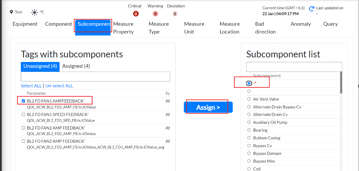 To assign a subcomponent to tags, follow similar steps as mentioned for equipment assignment.