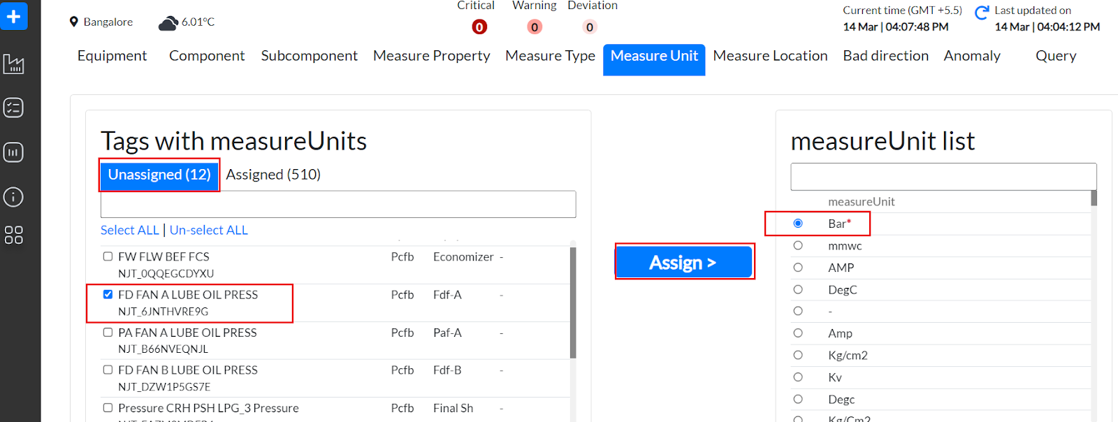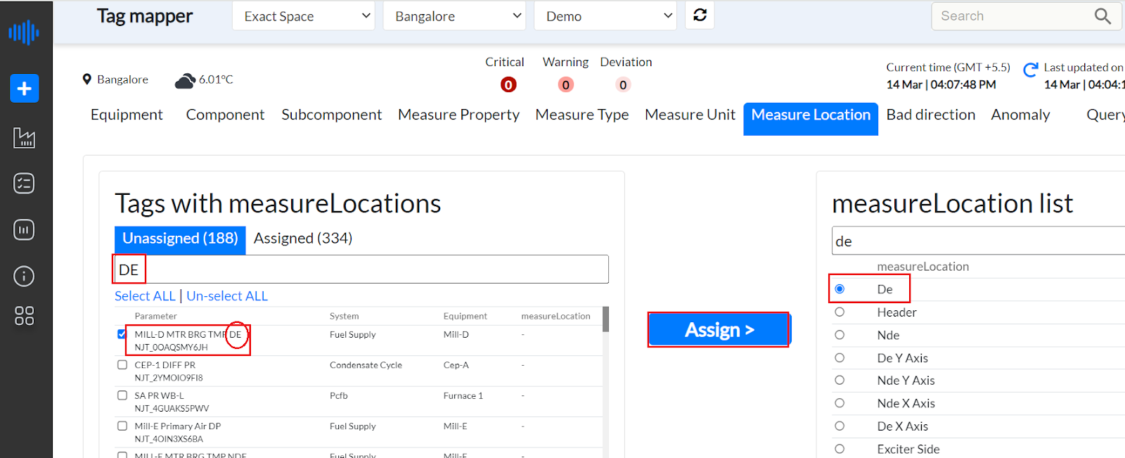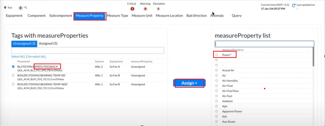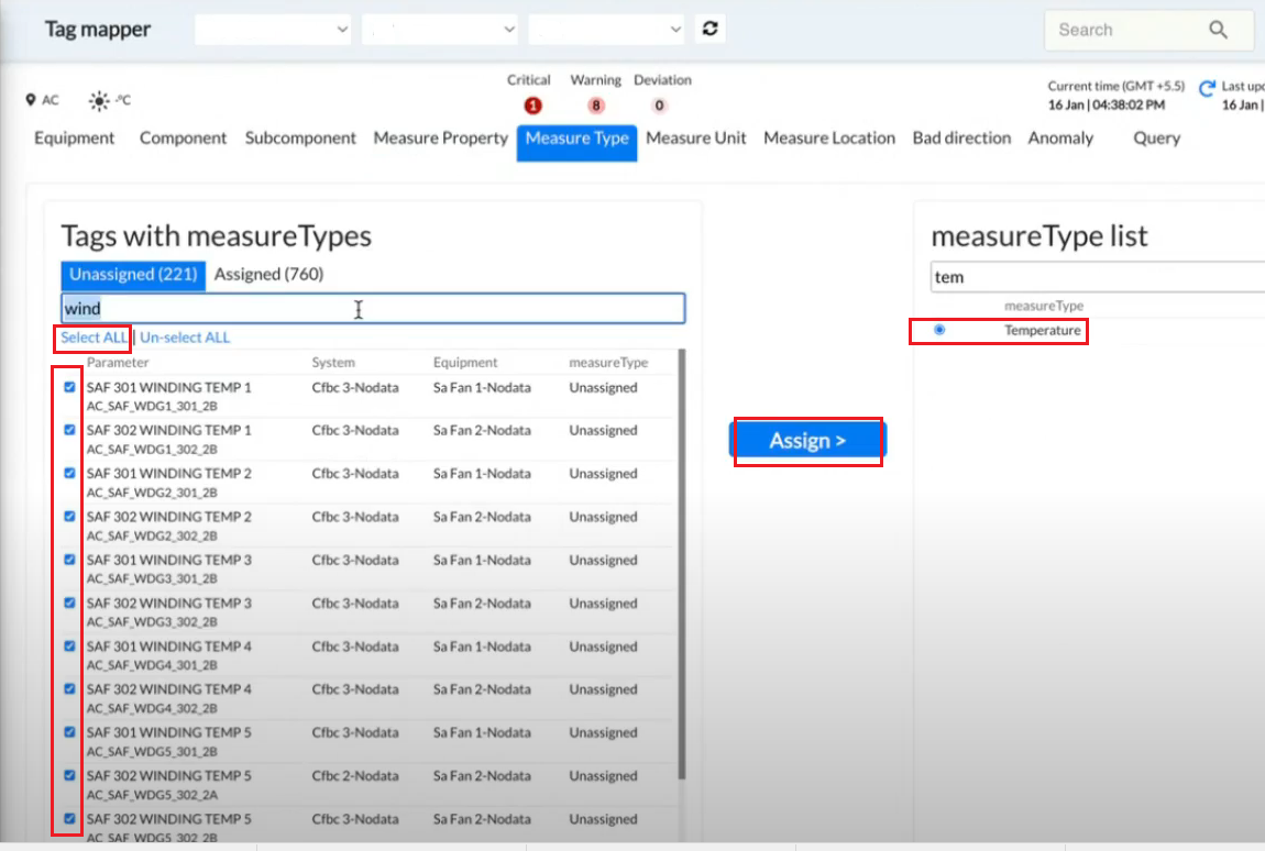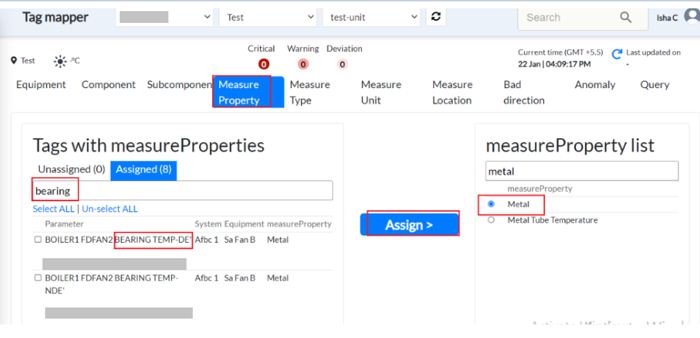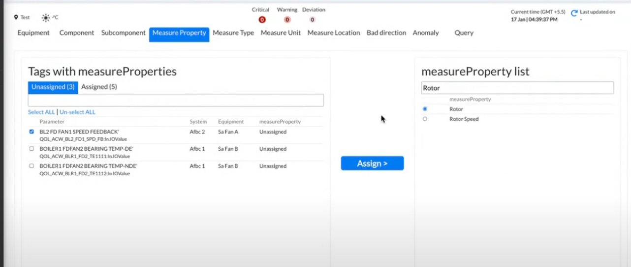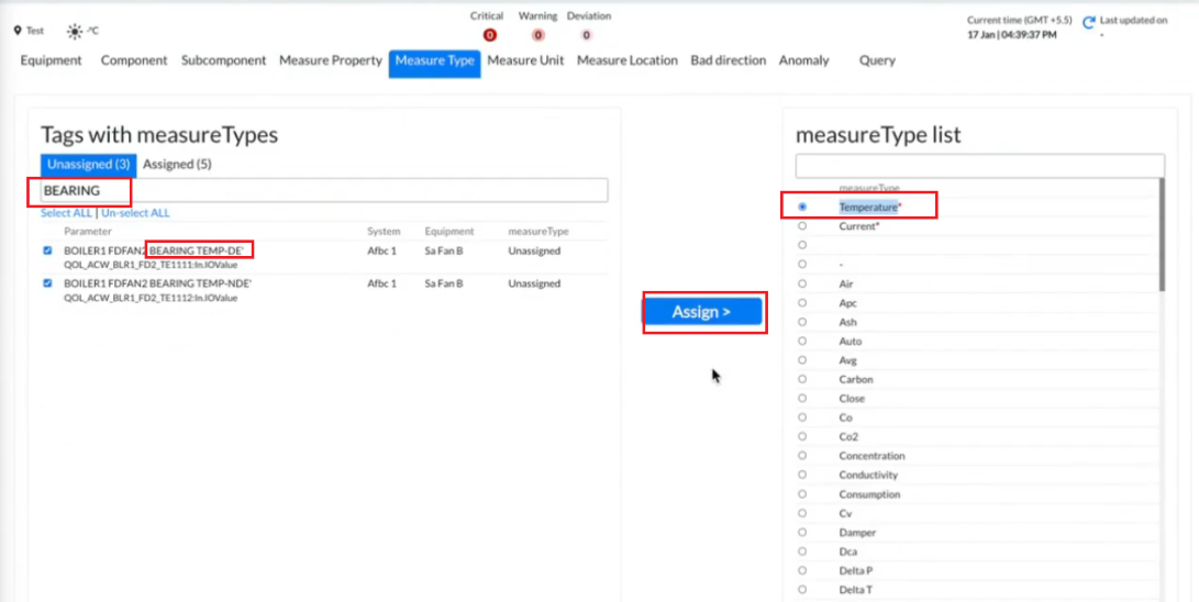 Similarly, if you check for Bearing Temp-DE. Type “bearing’ in Tags with measure properties on the left side. On the right side, you get the option of metal which is its measure property. Select all bearing temperatures you want to assign metal as a measure property. Click on “Assign”