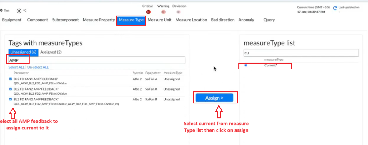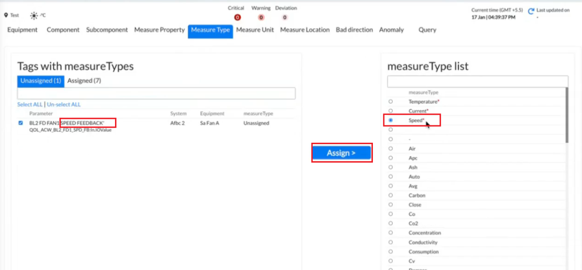 To assign a Measure Type to tags, follow similar steps as mentioned for equipment assignment.