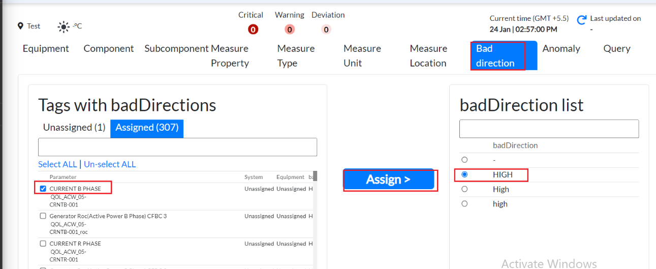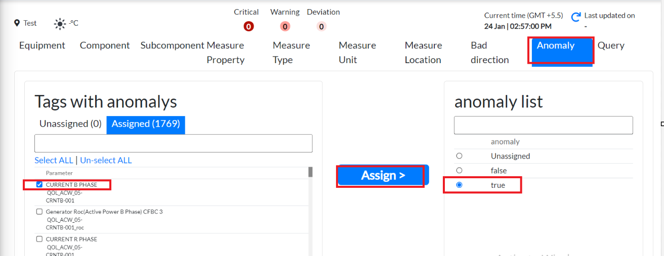 This feature is primarily intended for creating alarms and is not directly related to metadata. Therefore, all tags are displayed as assigned, as it's crucial for all tags to trigger alarms in the event of value changes beyond specified limits. “Unassign” tags which cannot raise an anomaly i.e. if a particular tag is not needed in fault tree or to raise a concern, assign that tag as “false” in anomaly, then alarm will not be triggered from there.