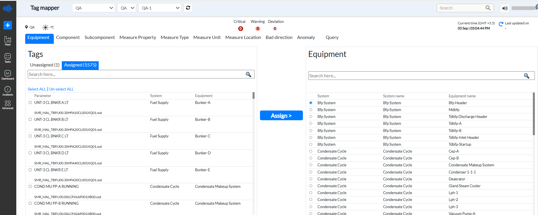 The Tag Mapper feature of Pulse Platform allows users to map or assign the Sensors (Tags) to Equipment/Assets, Components, and/or Sub-Components, Measure Property, Measure Type, Measure Units, and Measure Location (the location at which the sensor is placed). For example, Inlet, Outlet, etc. all these sensors when onboarded remain Unassigned until you assign them to the relevant System, Equipment/Asset, Component, or Sub-Component.
