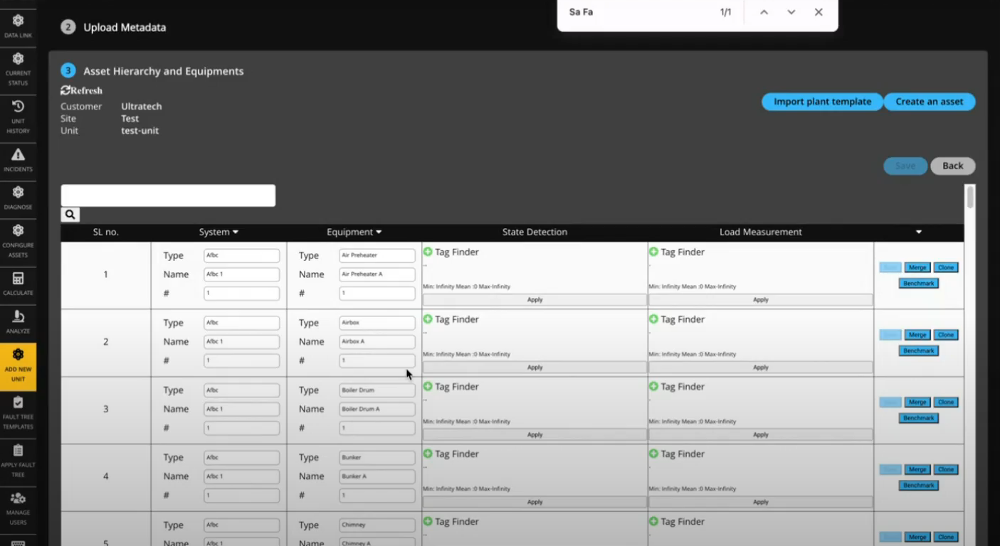 Upload the system and equipment information in Asset Hierarchy and Equipments by clicking on “Create an asset” or through “Import Plant template” or by “Uploading metadata” through an Excel sheet. Refer to section 2.2.1 to “Create an asset” 2.2.2 for Import plant template and section 2.1 to upload metadata through Excel of this user guide for detailed information on this topic.
